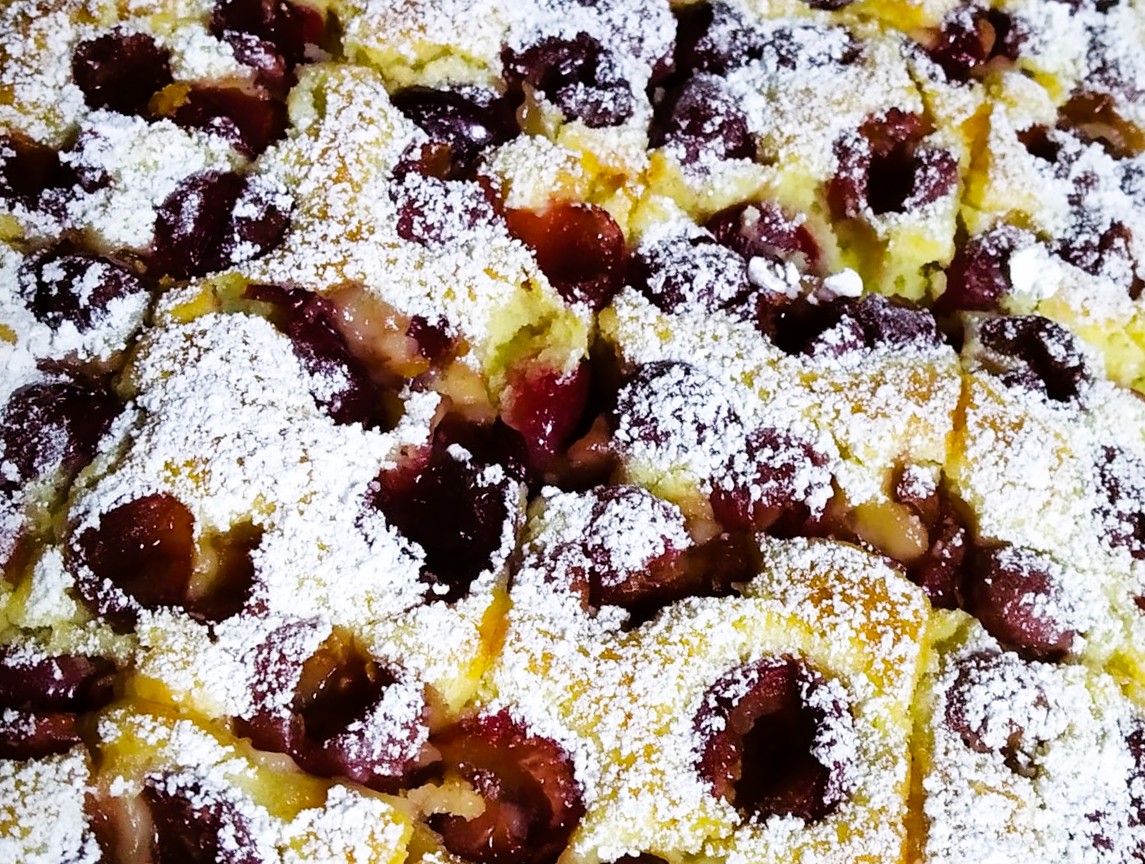 Sütőpapírral kivételt gáztepsibe öntjük, elsimítjuk, majd nagyjából félkiló cseresznyét kimagozva rászórunk.