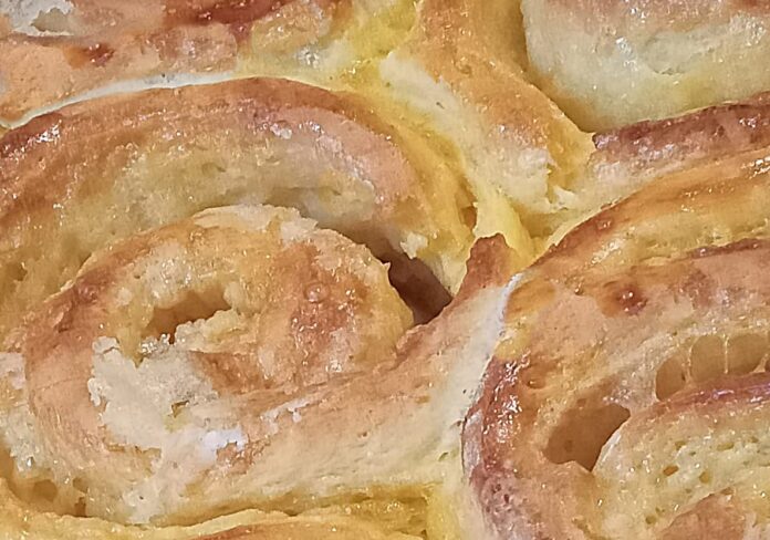 Ha a tészta megkelt, akkor két darabra vágjuk, kinyújtjuk ujjnyi vastagra, majd átkenjük a habosra kikevert cukor felével.